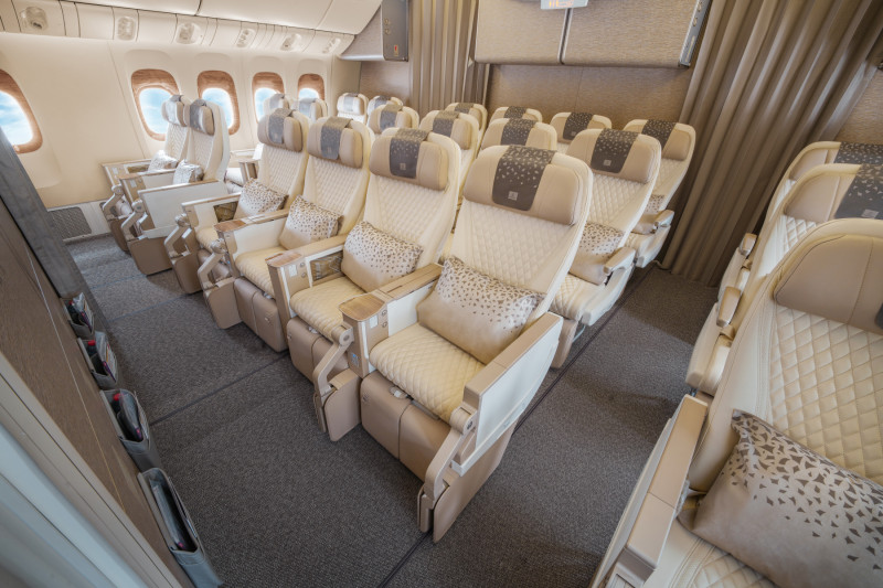 O Boeing 777 da Emirates, reformado e com quatro classes, apresenta interiores modernizados com novos elementos de design, incluindo paletas de cores contemporâneas, motivos da árvore Ghaf especialmente criados e acabamentos em madeira em todas as cabines. Cada aeronave inclui 260 assentos de última geração na Classe Econômica, 24 assentos na Classe Econômica Premium, 40 assentos na Classe Executiva em configuração 1-2-1 e oito suítes de Primeira Classe.