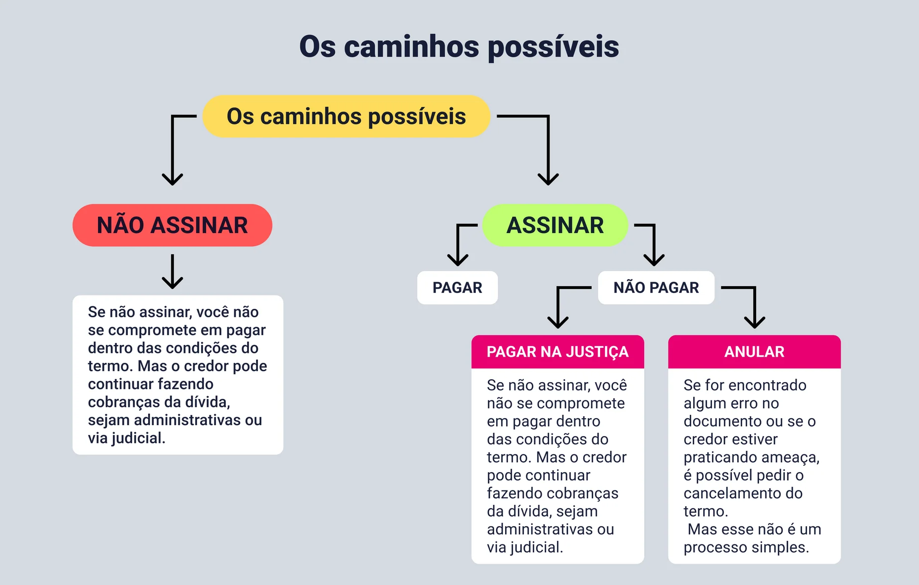 Por outro lado, deixar de assinar não significa que a cobrança não será efetuada de outras formas. Confira os caminhos possíveis depois de receber um pedido para assinar um termo de confissão de dívida: